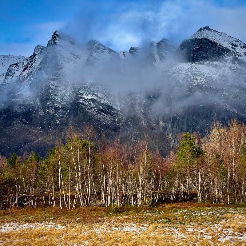 Dagens første solstråler treffer Steigtind en november formiddag.